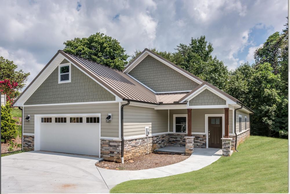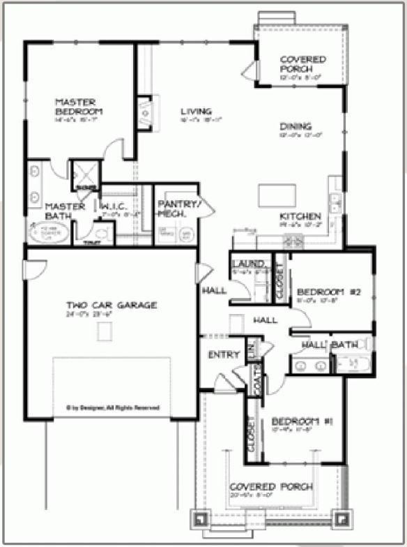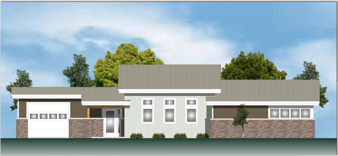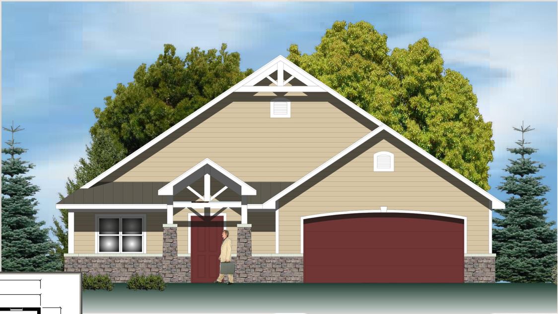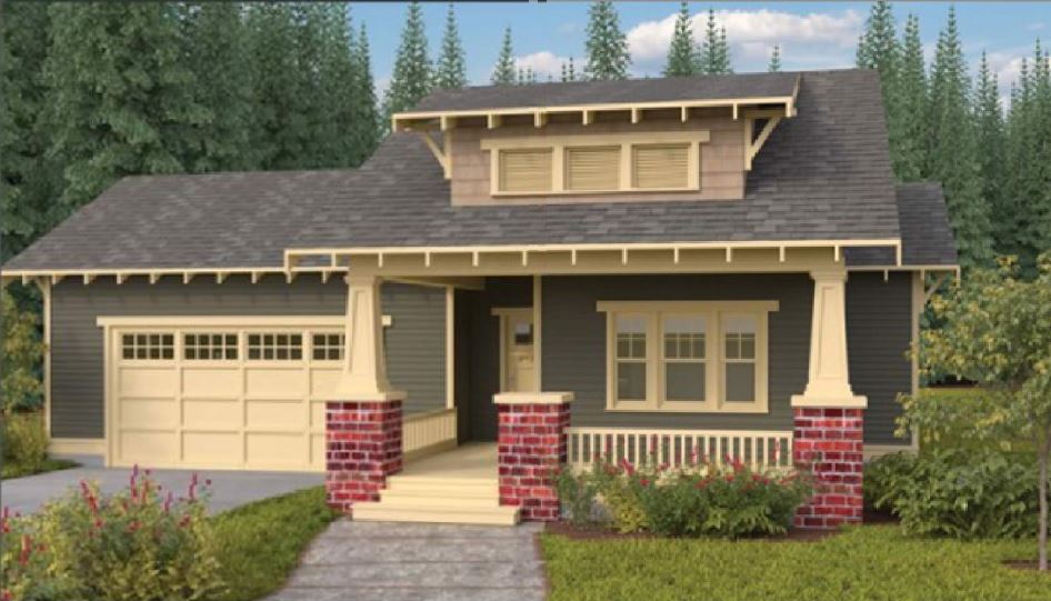 This 1290 sqft single-level house has 3 bedrooms, 2.5 bathrooms, a large living area, a full-size kitchen with room for an island, an attached 2 car garage, and a wrap-around porch.