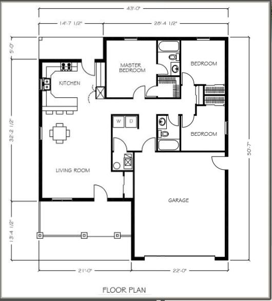 This 1290 sqft single-level house has 3 bedrooms, 2 bathrooms, a master suite, a large living area, and a full-size kitchen with room for an island.