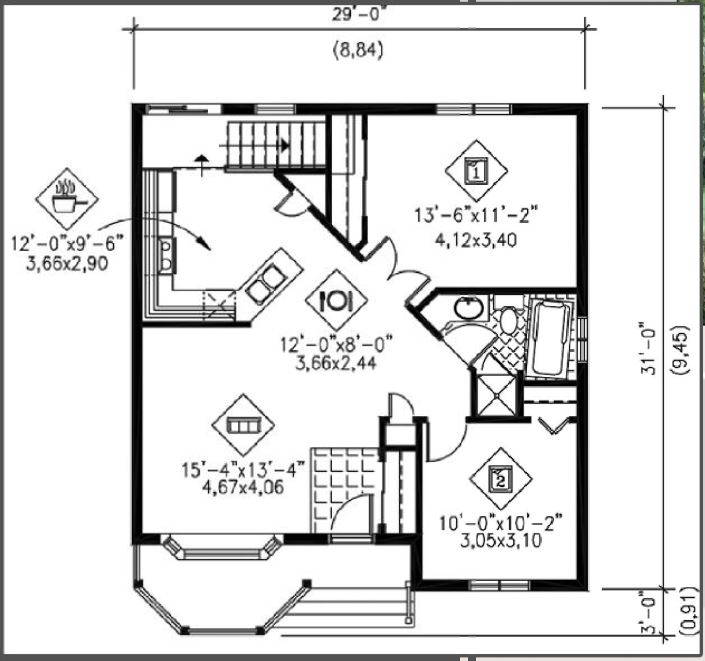 This 1152 sqft 2 story house has 2 bedrooms, 1.5  bathrooms, a large living area, a full-size kitchen with an island, and a wrap-around porch.