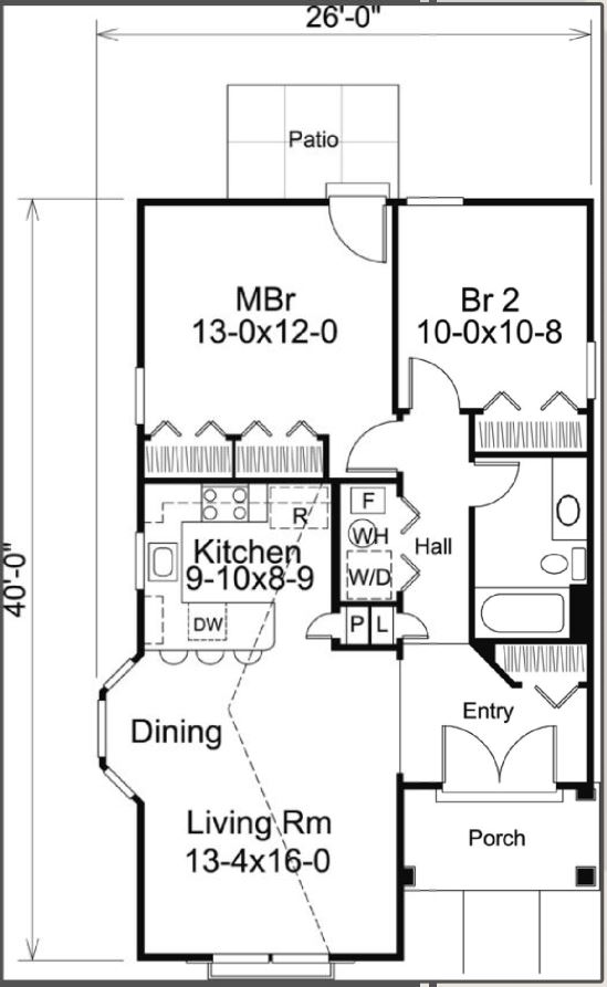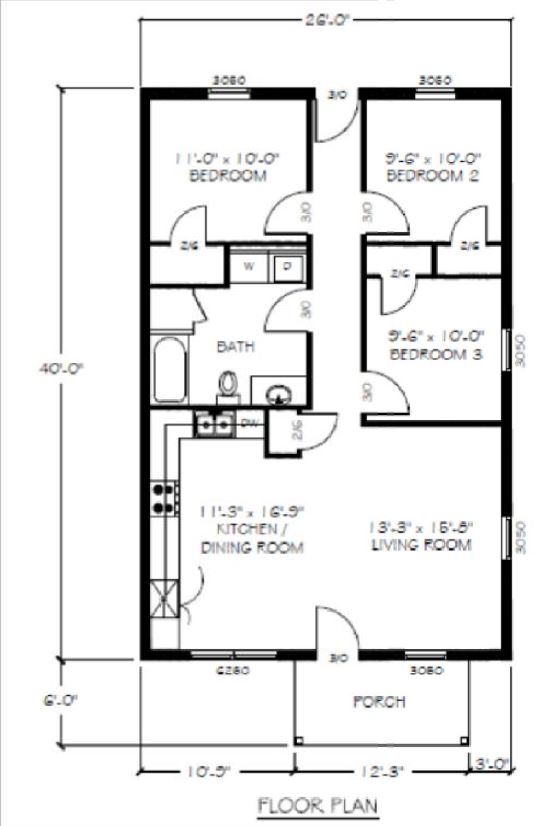 This house/ADU is 26ft wide by 40ft long plus front and back porches. This home has 2 Bedrooms, a full-size bathroom, a kitchen with a sit at peninsula, and Vaulted ceilings.