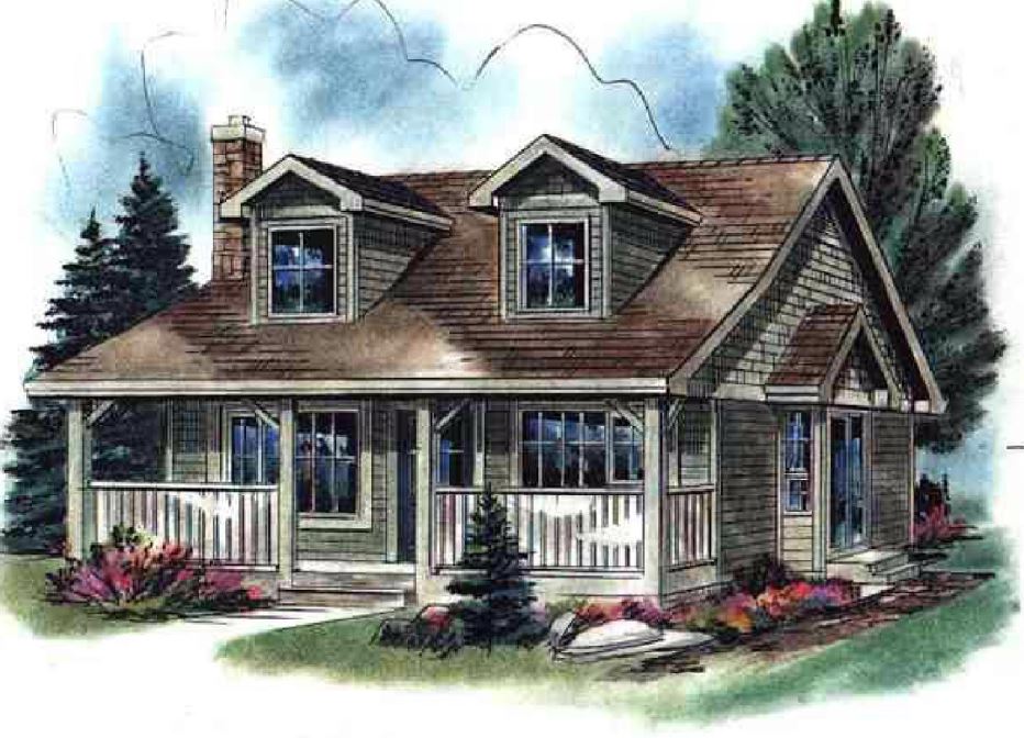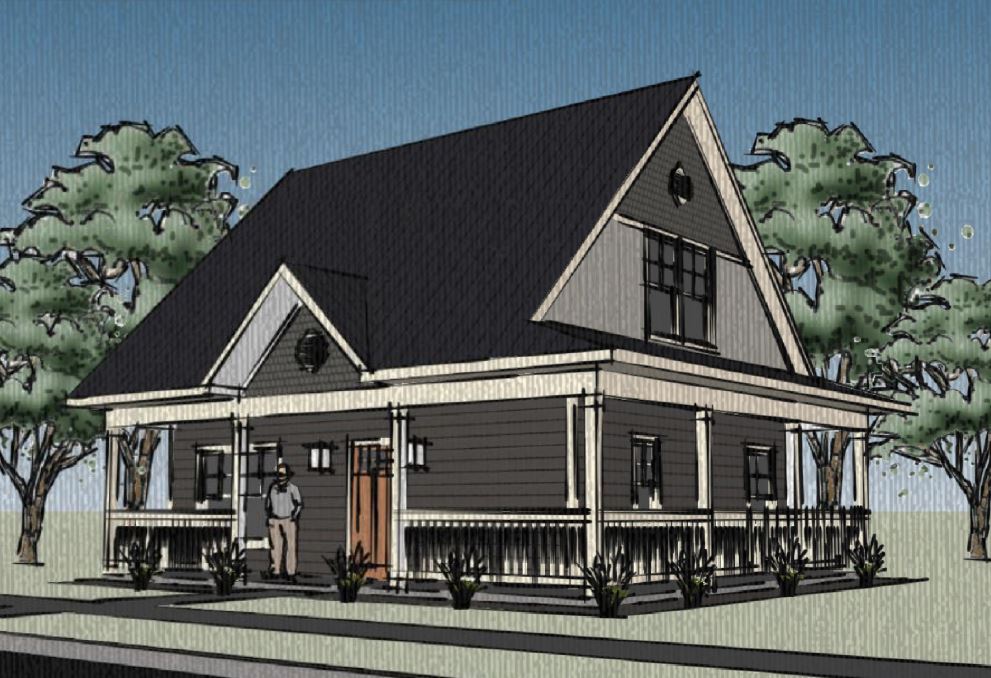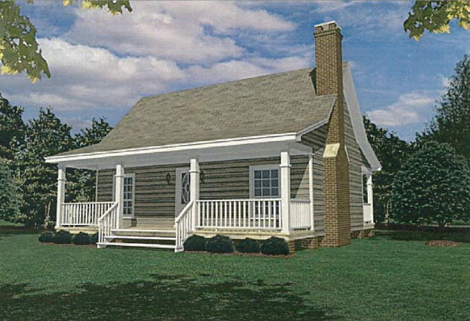 This 1226 sqft 2 story house has 3 bedrooms, 2  bathrooms, a large living area, a full-size kitchen with room for an island, and a wrap-around porch.