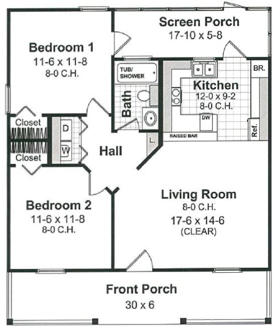 This house/ADU is 29ft wide by 31ft long plus a large front porch. This home has 2 Bedrooms, a full-size bathroom, a kitchen with a peninsula, and Vaulted ceilings.