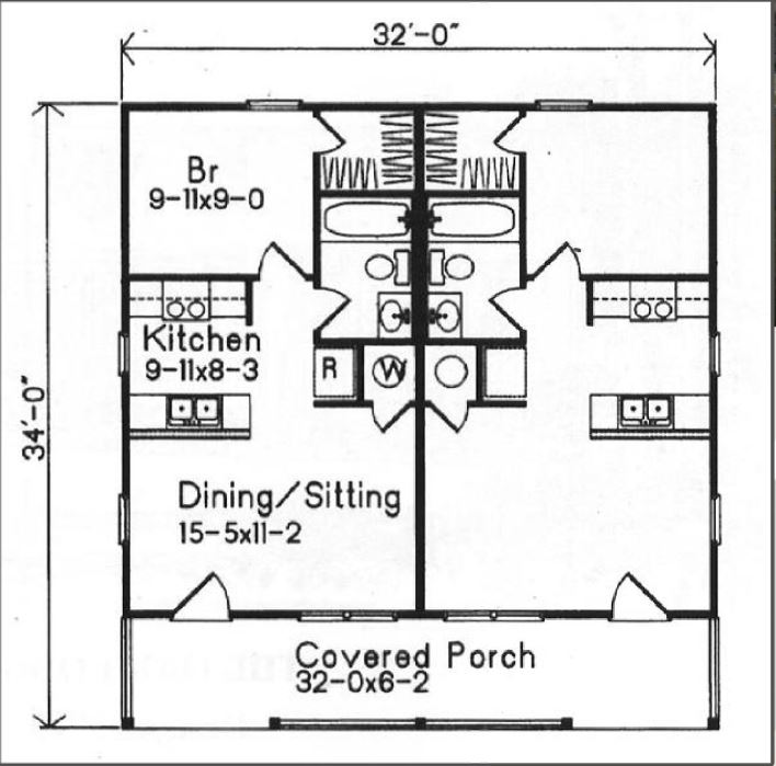 This is a duplex ADU with 2 separate living units. It is 32ft wide by 34ft long plus front porch. Each unit has 1 Bedroom, a full-size bathroom, a kitchen, and Vaulted ceilings.