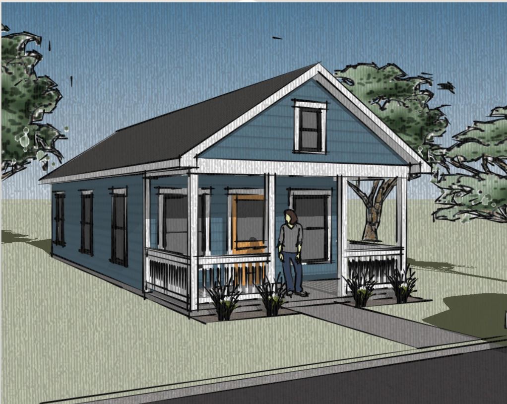 This house/ADU is 26ft wide by 36ft long plus a large front porch. This home has 2 Bedrooms, a full-size bathroom, a kitchen with an island, and Vaulted ceilings.