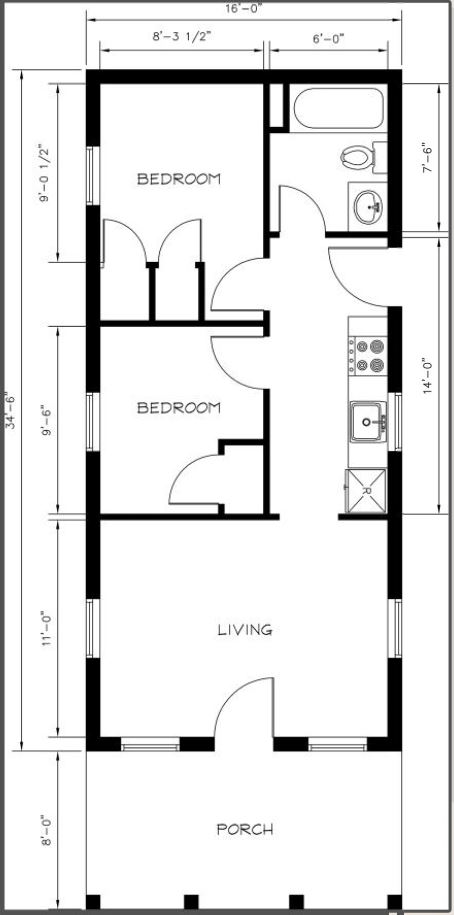This ADU/Tiny House is 16ft wide by 34.5ft long plus a large front porch. This home has 2 Bedrooms, a full-size bathroom, a galley kitchen, and a storage/sleeping loft.